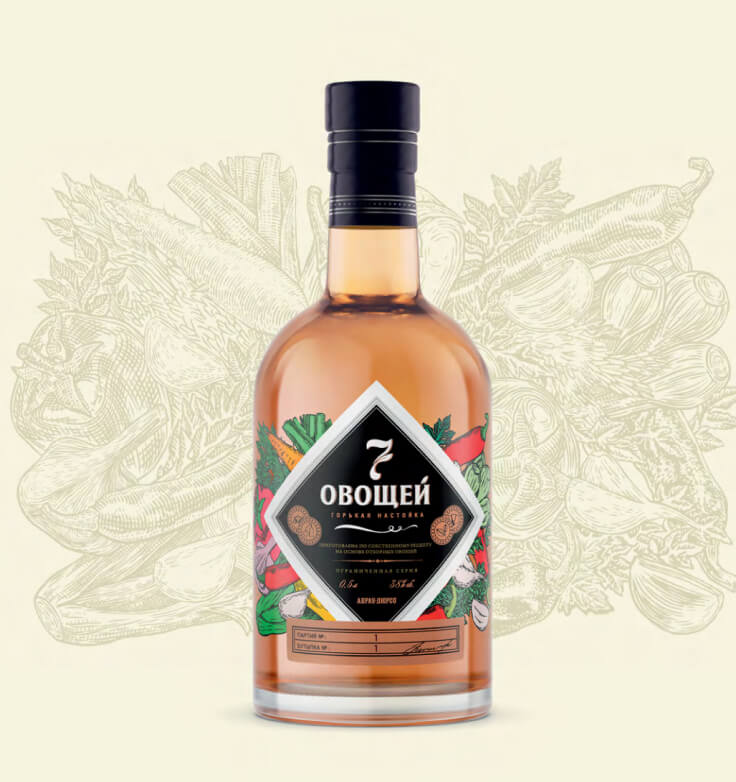 Настойка «7 овощей» приготовлена по авторскому рецепту на основе свежих овощей, собранных и обработанных вручную.